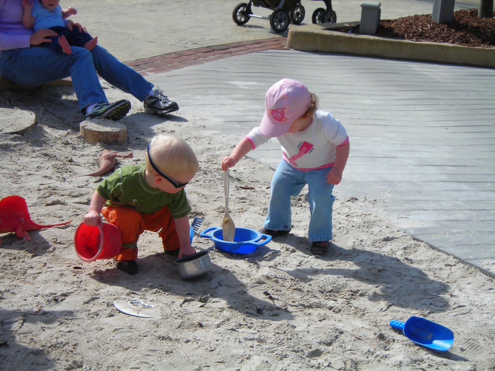 We have made some good friends (who I’ve posted about before).  For my birthday, Jeff gave me my one requested gift…a family membership to Lewis Ginter Botanical Gardens.  We’ve been twice (and will get there again one day this week).  Last week, we went with a few other mom’s including my friend, Amy, and her son, Jackson.  Jackson and Ella take good pictures together.  Here, I believe they are conspiring to be chefs one day: